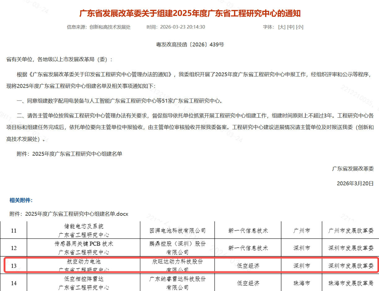 日前,广东省发展和改革委员会发布了关于组建2025年度广东省工程研究中心的通知。其中披露,欣旺达动力科技股份有限公司将牵头组建“航空动力电池广东省工程研究中心”。该中心将瞄准航空器动力电池这一前沿领域,重点研发高安全、高比能的固态航空动力电池,旨在突破关键技术瓶颈,为广东省打造世界级低空制造高地、培育新质生产力提供核心动力支撑。